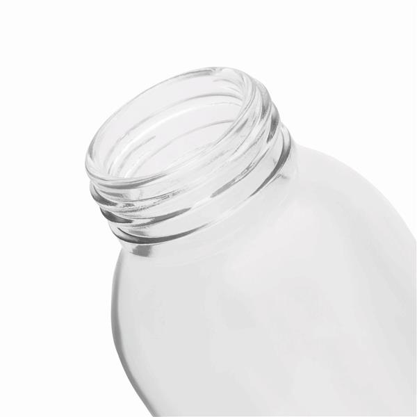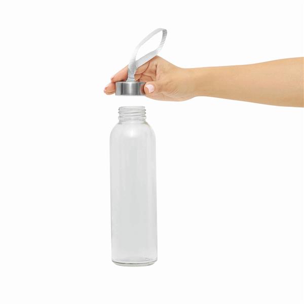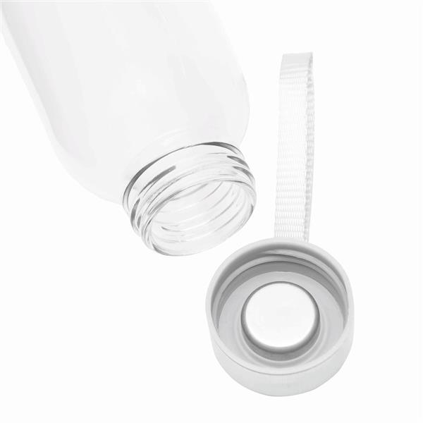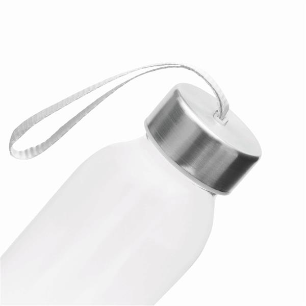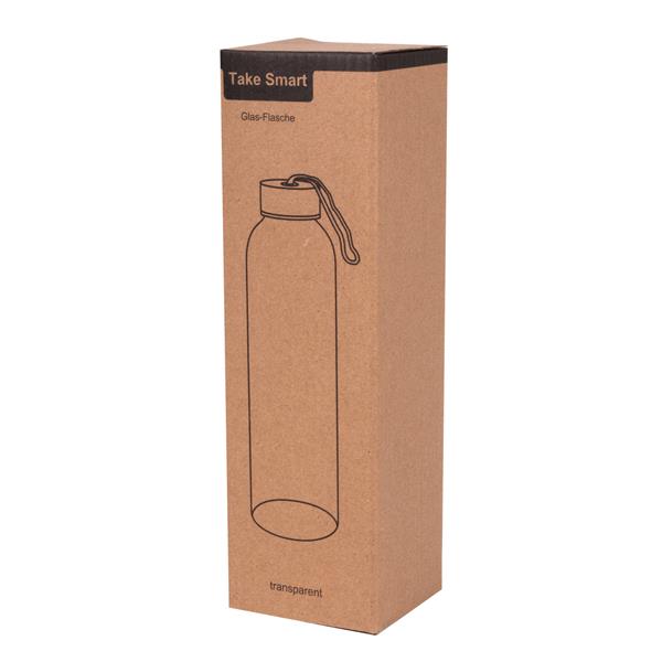 Butelka szklana TAKE SMART. Zakrętka ze stali nierdzewnej z uszczelką silikonową i smyczą. Pojemność ok. 500 ml, w białym pudełku.