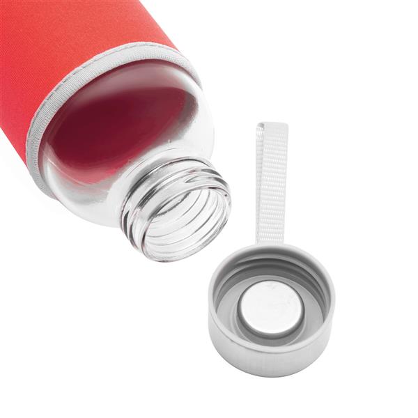Szklana butelka TAKE WELL z nakrętką i uchwytem do przenoszenia, z kolorową osłonką, pojemność ok. 450 ml. Materiał: Szkło/SBR/Stal nierdzewna Kolor: czerwony, transparentny Tagi: Butelki,outdoor,artykuły rekreacyjne,akcesoria piknikowe,butelki szklane