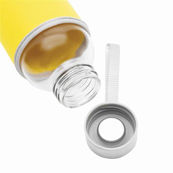 Szklana butelka TAKE WELL z nakrętką i uchwytem do przenoszenia, z kolorową osłonką, pojemność ok. 450 ml. Materiał: Szkło/SBR/Stal nierdzewna Kolor: transparentny, żółty Tagi: Butelki,outdoor,artykuły rekreacyjne,akcesoria piknikowe,butelki szklane