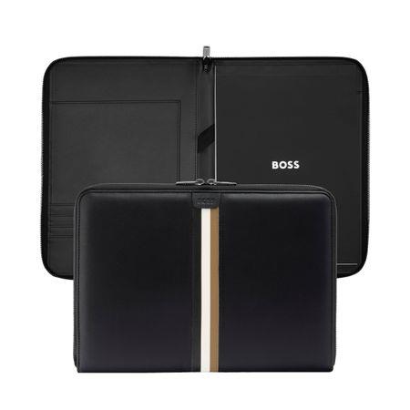 Teczka A4 od BOSS łączy w sobie estetykę inspirowaną aktywnością z luksusowym podejściem. Wykonany z gładkiego, miękkiego czarnego PU, posiada nadrukowany 3-kolorowy ikoniczny element paska na środku. Logo BOSS jest luksusowo wytłoczone na metce zdobiącej górną część paska, a metalowe zamki błyskawiczne z logo BOSS dodają wyrafinowanego charakteru. Ta teczka została zaprojektowana dla miłośników marki, oferując stylowy, ale funkcjonalny sposób na uporządkowanie dokumentów.