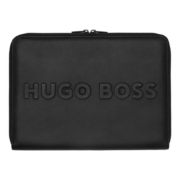 Linia Label została stworzona na cześć odważnych, nowych logotypów marki, czerpiąc z ich współczesnego wyglądu i stylu oraz nowego spojrzenia na minimalistyczny design. Tradycyjne, ponadwymiarowe logo zostało na nowo wyobrażone i odświeżone dzięki efektowi 3D, co pozwoliło na zachowanie eleganckiego i stonowanego wyglądu, z wyrafinowanymi akcentami i monochromatycznymi detalami. Ten element jest wykonany z pięknie teksturowanej skóry wegańskiej, a wszystkie wykończenia są monochromatyczne, matowo czarne, nadając mu minimalistyczny charakter. Ikoniczny suwak `HUGO BOSS` został w tym sezonie odświeżony, zachowując ten sam nowoczesny wygląd, ale z nieco zmodernizowanym kształtem. Idealnie pasuje do tytułowych długopisów lub innych przyborów do pisania z kolekcji.
