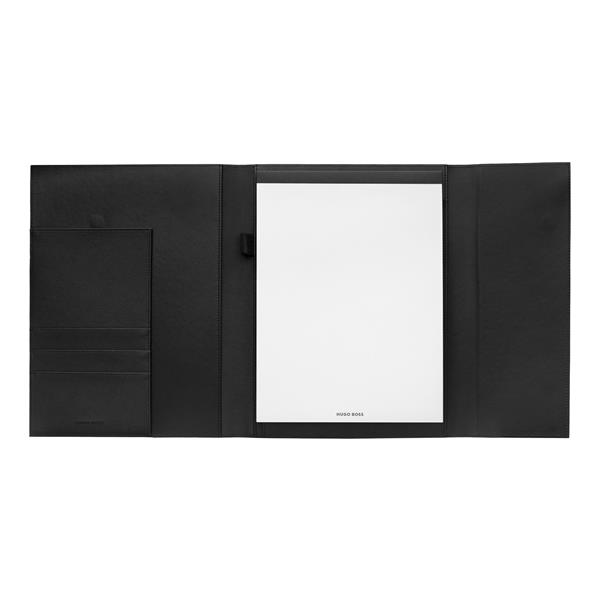 Teczka `Pinstripe`, jak sama nazwa wskazuje, posiada pięknie teksturowany materiał 3D w paski, jeden z charakterystycznych wzorów domu mody HUGO BOSS, przypominający o jego dziedzictwie w dziedzinie garniturów. Nadruk jest wykonany na nowo dzięki innowacyjnej obróbce powierzchni i kontrastowi z wegańską skórą użytą do zamknięcia klapy i ozdobiony wyraźną chromowaną tabliczką z podpisem HUGO BOSS.