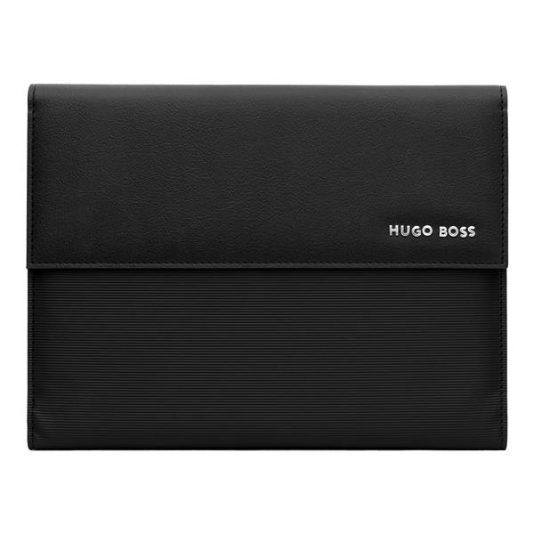 Teczka `Pinstripe`, jak sama nazwa wskazuje, posiada pięknie teksturowany materiał 3D w paski, jeden z charakterystycznych wzorów domu mody HUGO BOSS, przypominający o jego dziedzictwie w dziedzinie garniturów. Nadruk jest wykonany na nowo dzięki innowacyjnej obróbce powierzchni i kontrastowi z wegańską skórą użytą do zamknięcia klapy i ozdobiony wyraźną chromowaną tabliczką z podpisem HUGO BOSS.