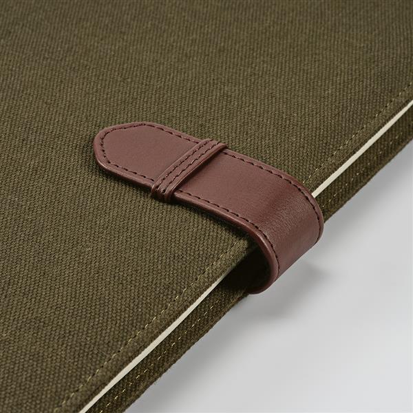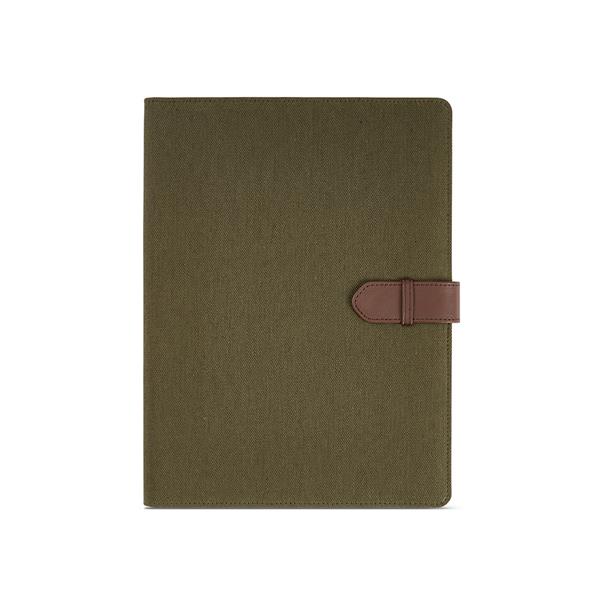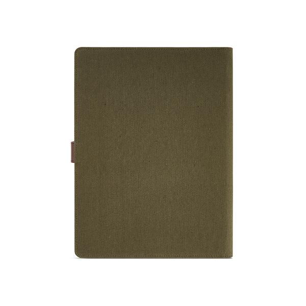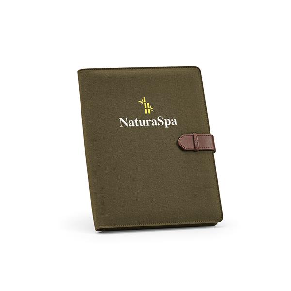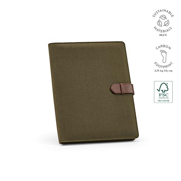 Teczka A4 z bawełnianego płótna z recyklingu pozwala na uporządkowanie dokumentów. Zamknięcie na zatrzask z poliuretanu z recyklingu zabezpieczy twoje rzeczy, a etui na tablet, 64 strony w kropki FSC, uchwyt na długopis i miejsca na karty zapewnią funkcjonalność. Całość jest w indywidualnym pudełku kraft z recyklingu.