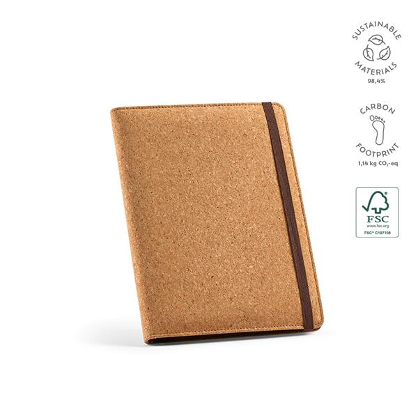 Zanurz się w świat zrównoważonej organizacji dzięki naszemu korkowemu skoroszytowi A5. Zawiera elastyczne zamknięcie, 64 arkusze papieru FSC w kolorze kości słoniowej (70 g/m2), kieszeń na telefon (do 10 x 18 cm), uchwyty na długopisy i 2 miejsca na karty. Bądź ekologiczny i zorganizowany.