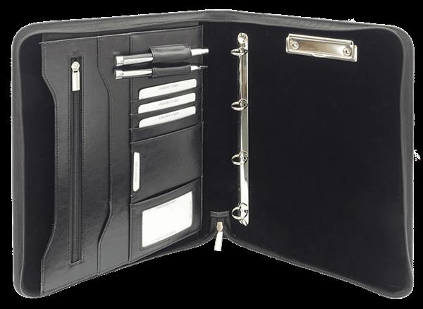 2 uchwyty na pióra 3 kieszenie na dokumenty 5 kieszeni na wizytówki Kieszeń zapinana na suwak Klip Ring Rączka w grzbiecie Zamknięcie na suwak Materiał: Ekoskóra Nebraska Rozmiar: (A4) 26 x 35 x 4 cm Kolor: czarny Znakowanie: 147903640