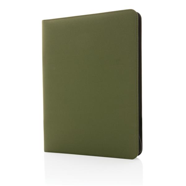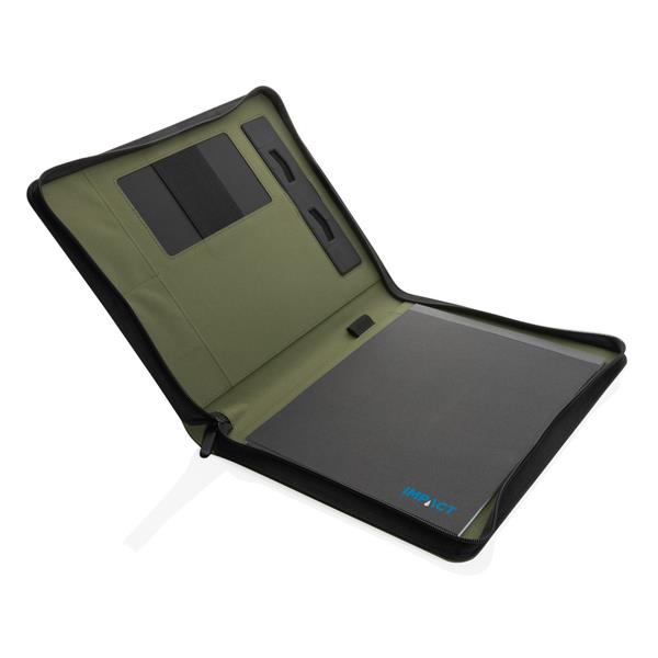 Teczka konferencyjna A4 z notatnikiem (20 kartek z 64 g/m2 papieru z recyklingu w linie), zamykana na zamek błyskawiczny, wewnątrz kieszeń i stojak na telefon, 2 kieszenie na wizytówki i pętla na akcesoria do pisania, wykonana z 8 poddanych recyklingowi butelek PET (500 ml), dzięki zastosowaniu technologii AWARE™ wykorzystane materiały są identyfikowalne z pochodzenia, 2% wpływów z każdego sprzedanego produktu z kolekcji Impact jest przekazywane na rzecz Water.org, nie zawiera PVC
