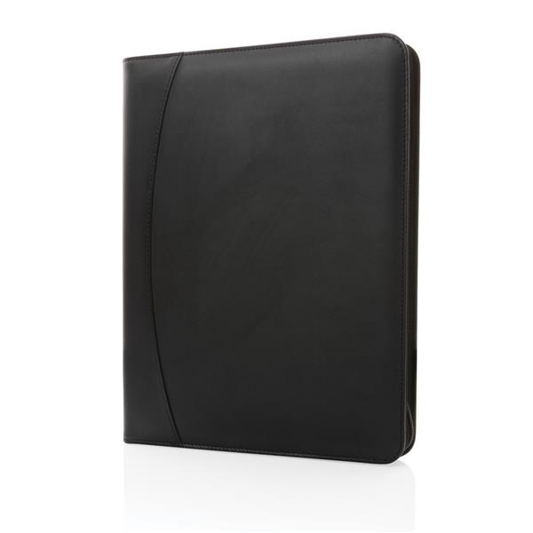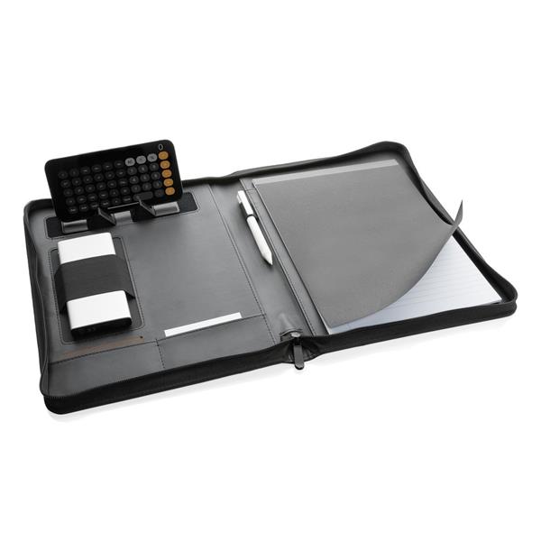 Teczka konferencyjna A4 z notatnikiem (20 kartek z 64 g/m2 papieru z recyklingu w linie), zamykana na zamek błyskawiczny, wewnątrz kieszeń i stojak na telefon, 2 kieszenie na wizytówki i pętla na akcesoria do pisania, wykonana w 100% z PU z recyklingu z certyfikatem RCS (Recycled Claim Standard) który gwarantuje, że wykorzystane materiały pochodzą z recyklingu, całkowita zawartość materiału z recyklingu obliczona w oparciu o wagę całkowitą przedmiotu: 14%, nie zawiera PVC