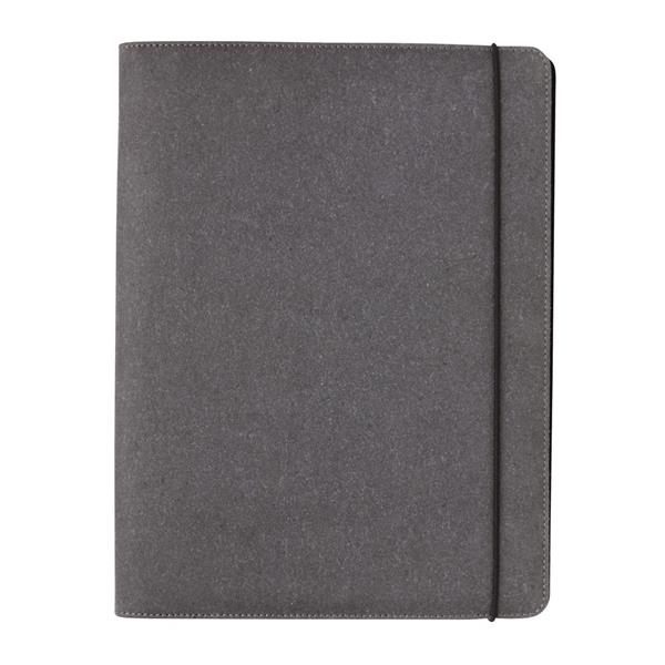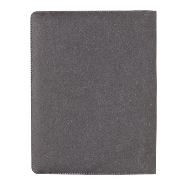 Teczka konferencyjna A4 z notatnikiem (20 kremowych kartek 64 g/m2 z papieru z recyklingu w linie), okładka wykonana ze skóry pochodzącej z recyklingu, wewnątrz 1 duża kieszeń, 3 kieszenie w rozmiarze telefonu, miejsce na 4 wizytówki, ślad węglowy produktu: 2,06 kg CO2