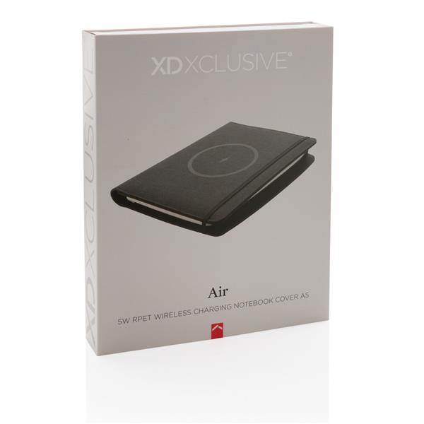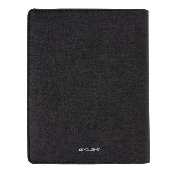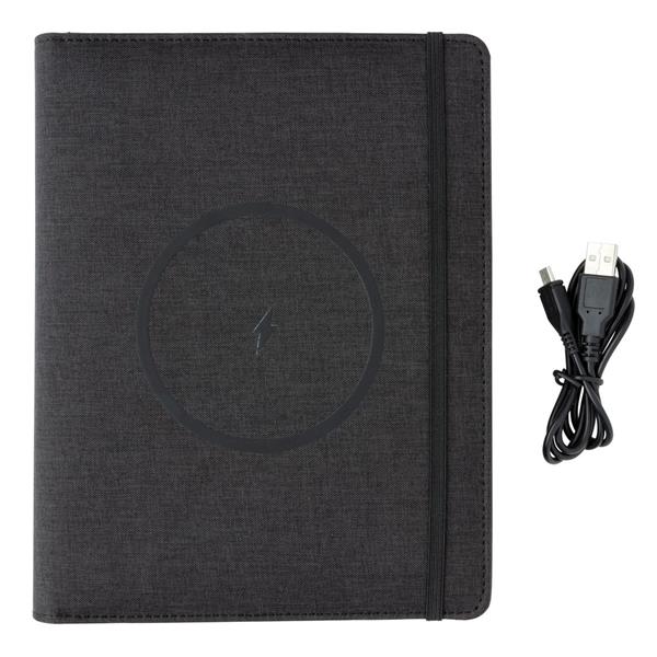 Teczka konferencyjna A5 wykonana z rPET, bezprzewodowy power bank 5000 mAh, ładowarka bezprzewodowa 5W na przedniej stronie okładki, port USB do ładowania urządzeń za pomocą kabla, bezprzewodowe ładowanie jest kompatybilne ze wszystkimi urządzeniami posiadającymi możliwość ładowania indukcyjnego, wejście 5V/2.1A, wyjście 1: 5V/2.1A, wyjście 2: 5V/2.1A, wyjście bezprzewodowe 5W, wzór zastrzeżony®, ślad węglowy produktu: 4,45 kg CO2