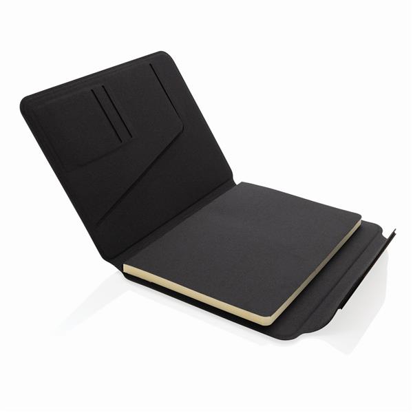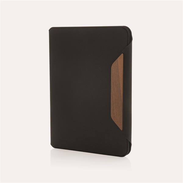 Teczka konferencyjna A5 AWARE™ RPET Teri, wykonana z recyklingowanego poliestru RPET z certyfikatem AWARE™, magnetyczne zamknięcie, emblemat z drewna orzechowego, 2 miejsca na wizytówki, kieszeń na dokumenty A5, notatnik A5 z papieru FSC® mix, 64 kremowe kartki w linie (128 stron), opakowanie prezentowe FSC® mix Fefco 427, bez PVC, 2% dochodu przeznaczone na Water.org