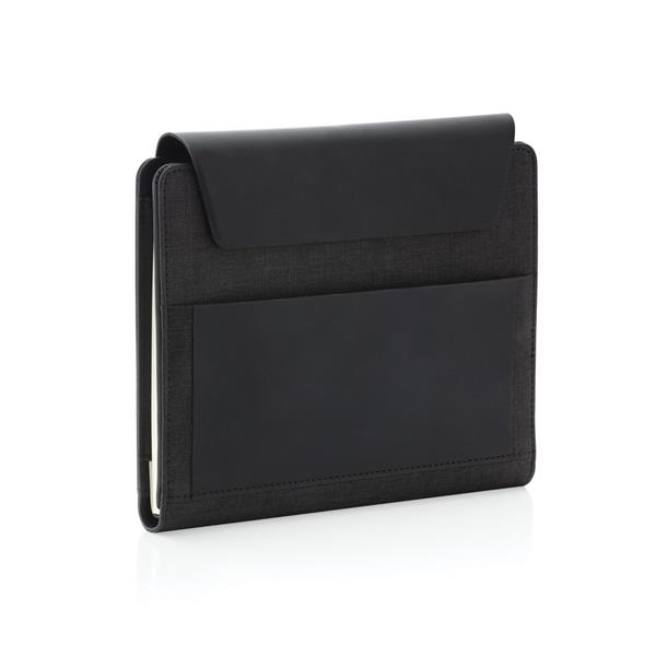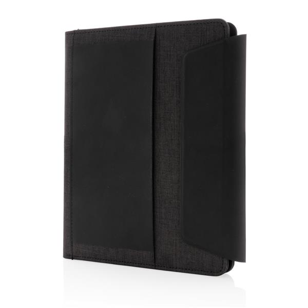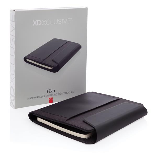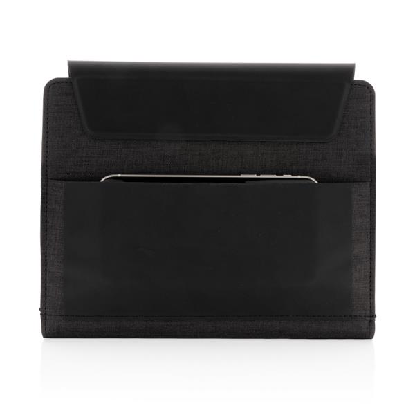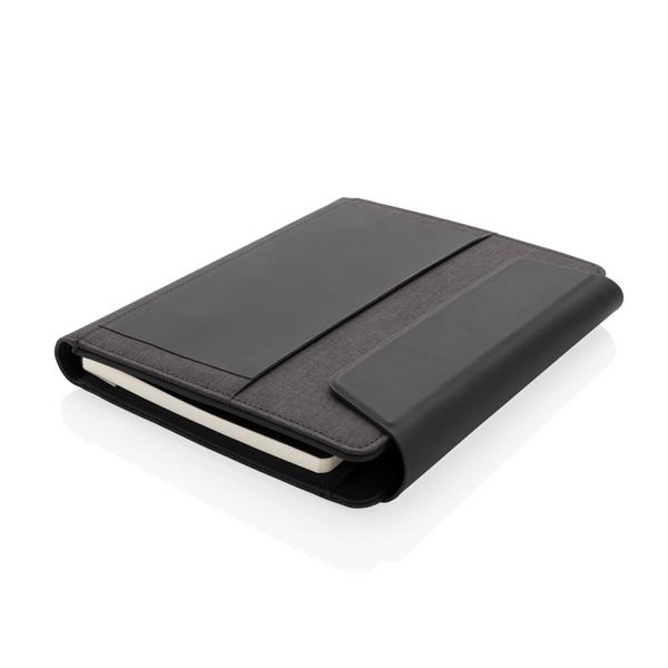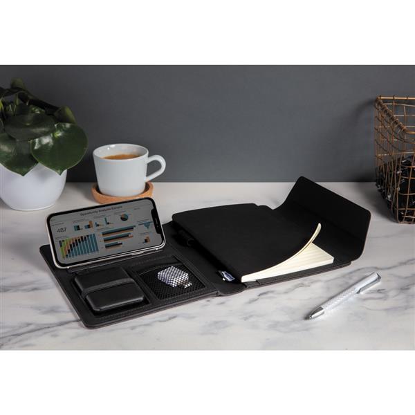 Teczka konferencyjna A5, notatnik (64 kremowe kartki 70 g/m2 w linie), ładowarka bezprzewodowa, power bank, wykonana z mieszanki materiałów rPET i PU, wewnątrz miejsce na przybory piśmiennicze, stojak na telefon i dodatkowe kieszenie, bezprzewodowe ładowanie jest kompatybilne ze wszystkimi urządzeniami posiadającymi możliwość ładowania indukcyjnego, wejście 5V/2A, wyjście 5V/2A, wejście bezprzewodowe 5V/2A, wyjście 5V/1A, w ozdobnym pudełku, ślad węglowy produktu: 4,19 kg CO2