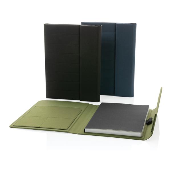 Teczka konferencyjna A5 z notatnikiem (64 kremowe kartki 80 g/m2 w linie), magnetyczne zamknięcie, wewnątrz duża kieszeń, 2 kieszenie na wizytówki i pętla na akcesoria do pisania, wykonana z 6,5 poddanych recyklingowi butelek PET (500 ml), dzięki zastosowaniu technologii AWARE™ wykorzystane materiały są identyfikowalne z pochodzenia, 2% wpływów z każdego sprzedanego produktu z kolekcji Impact jest przekazywane na rzecz Water.org, nie zawiera PVC
