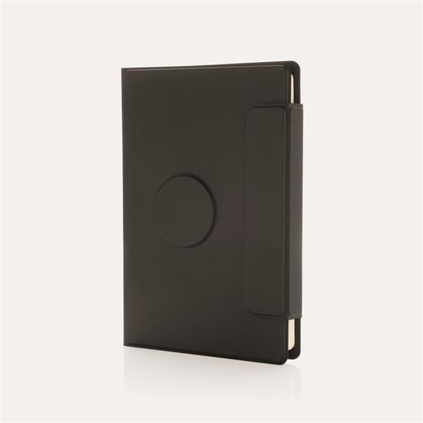 Teczka konferencyjna A5 Stuart, wykonana z recyklingowanego poliestru PU, zamknięcie magnetyczne, uchwyt na telefon kompatybilny z MagSafe (iPhone 12 i wyższe), notatnik A5 w linie, 64 kremowe kartki/128 stron o gramaturze 80 g/m2, certyfikat FSC®, kieszeń na dokumenty, 2 miejsca na wizytówki, możliwość wymiany notatnika