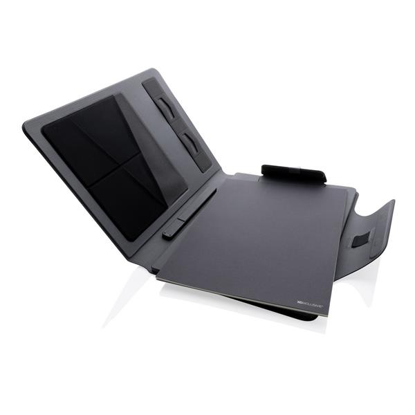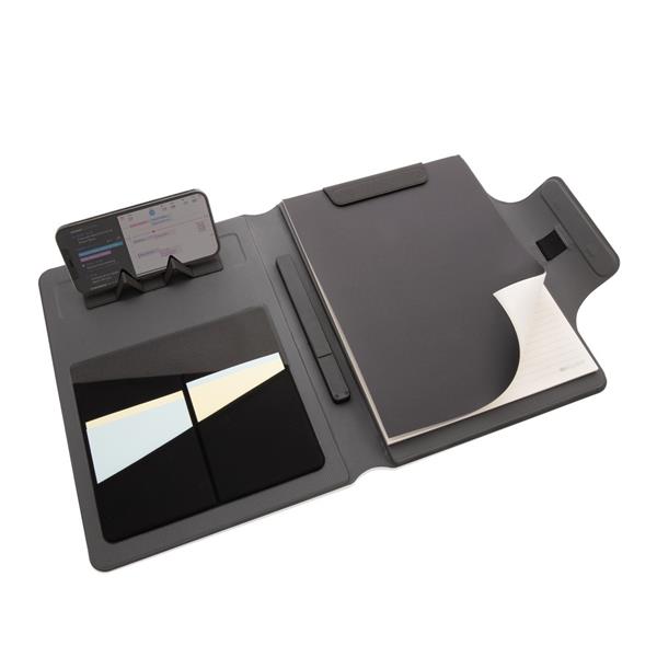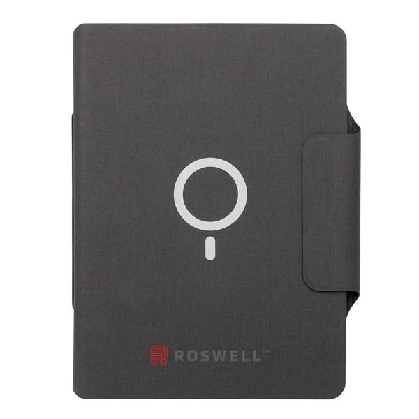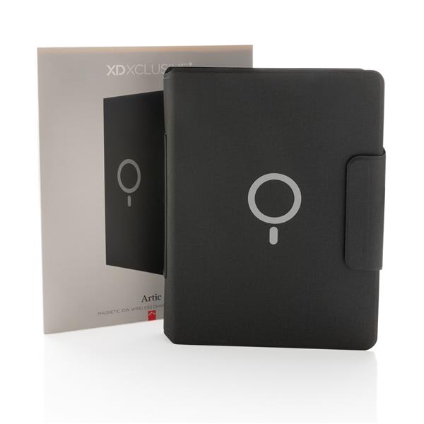 Teczka konferencyjna Arctic, magnetyczna ładowarka bezprzewodowa 10W, power bank 8000 mAh, notatnik (40 kremowych kartek w linie w gramaturze 80 g/m2), kieszeń na tablet lub telefon, pętla na przybory do pisania, 19 wbudowanych magnesów N52H odpornych na ciepło, dzięki idealnemu rozłożeniu magnesów ładowarka jest kompatybilna z telefonem iPhone 12, w przypadku urządzeń Android działa jak standardowa ładowarka bezprzewodowa, działa z telefonami posiadającymi możliwość ładowania indukcyjnego, wejście USB typu C 9V/2A, wyjście bezprzewodowe 9V/1.1A, wyjście USB typu C 9V/2A, wzór zastrzeżony, ślad węglowy produktu: 5,65 kg CO2