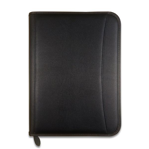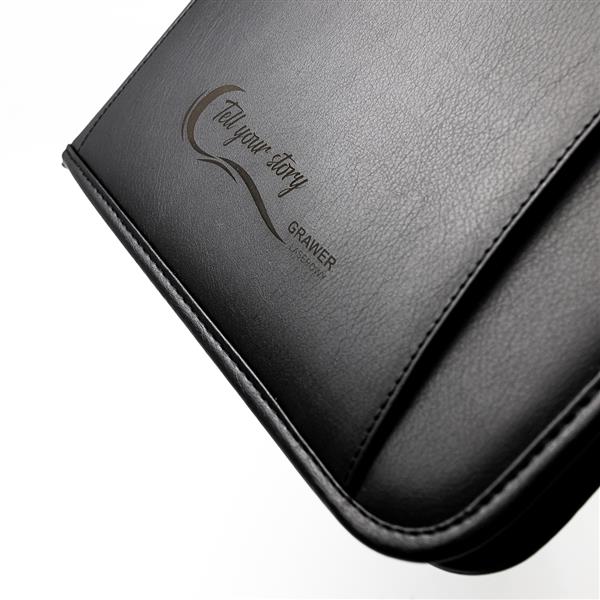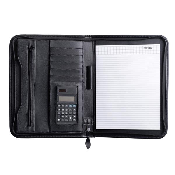 Wykonana z ekoskóry czarna teczka konferencyjna A4 z kalkulatorem, zapinana na zamek. Posiada aż 6 kieszonek, przegródki na dokumenty, uchwyt na długopis i kieszeń z zamkiem. Praktyczna teczka biznesowa wyposażona we wkład papierowy A4. Kalkulator zasilany 1 baterią AG10 dołączoną do produktu. Może pomieścić 20 wizytówek. Wyposażenie nie jest dołączone.