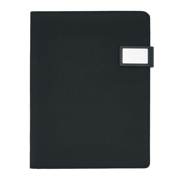 Teczka konferencyjna z magnetycznym zamknięciem, notatnik A4, stojak na tablet/telefon wewnątrz, kieszeń na telefon z przezroczystym okienkiem umożliwiającym dostęp do urządzenia, pasuje do większości popularnych telefonów takich jak iPhone 6 oraz Samsung S6 itp., kieszeń na dokumenty, 2 kieszenie na karty/wizytówki, miejsce na przybory do pisania, notatnik A4 (20 kartek w linie) w komplecie, ślad węglowy produktu: 2,3 kg CO2