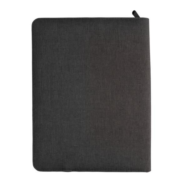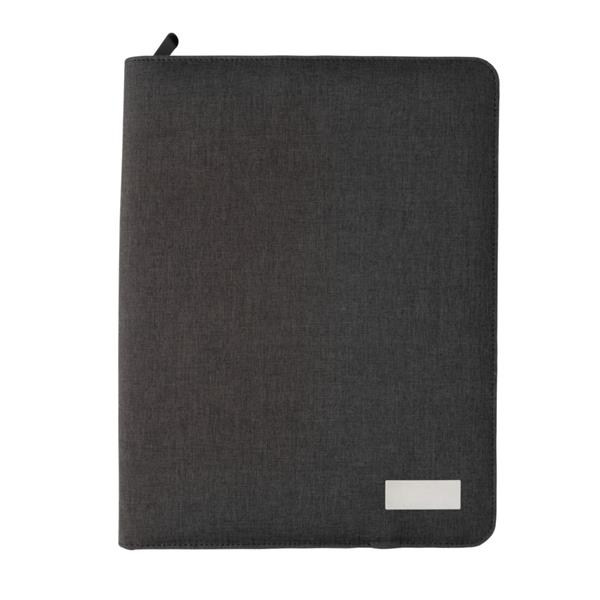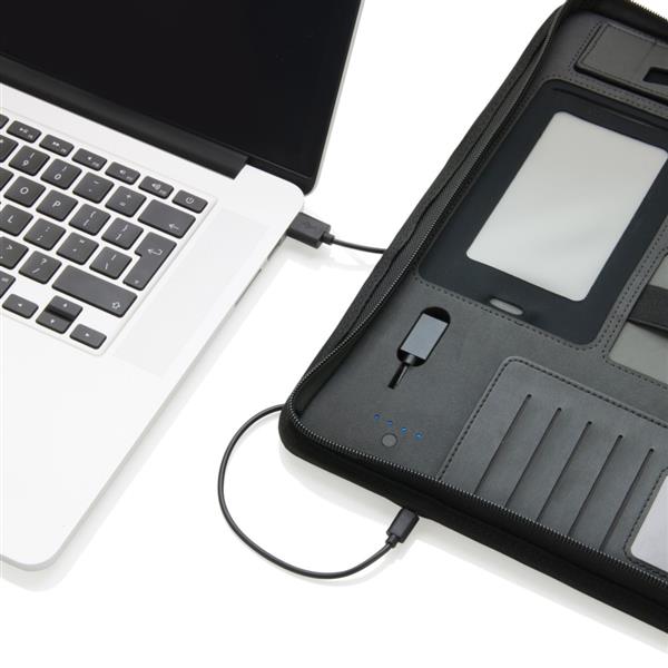 Teczka konferencyjna z notatnikiem A4 (w linie, zadruk jednostronny), power bank 4000 mAh, stojak na telefon lub tablet, wewnątrz kieszeń na telefon z transparentnym okienkiem oraz uchwyty na akcesoria, wyjście 5V/2.1A, wejście 5V/0.8A, kabel micro USB w komplecie, ślad węglowy produktu: 4,49 kg CO2