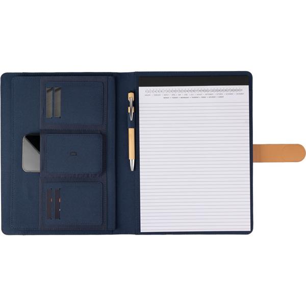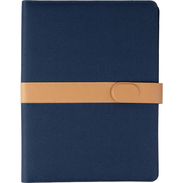 Teczka konferencyjna w formacie ok. A4, zawiera notatnik z 20 kartkami w linie, przegródki na dokumenty i pętelkę na długopis, zamknięcie magnetyczne, pakowany pojedynczo w kraftowy rękaw, produkt wykonany z RPET