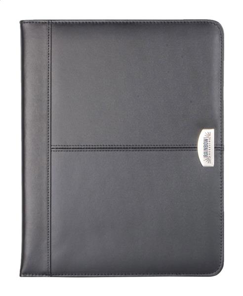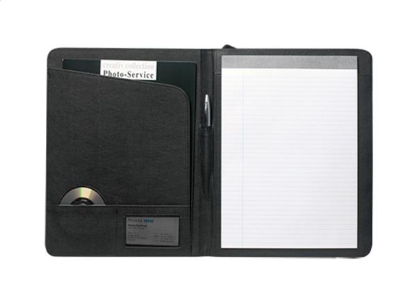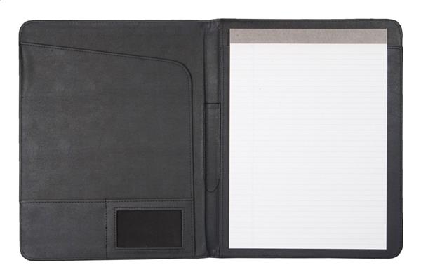 Teczka na dokumenty A4 ze skóry, z notatnikiem w linie oraz miejscem na długopis i wizytówki. Na okładce posiada metalową płytkę.