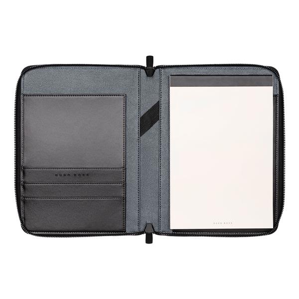 Elegancka teczka konferencyjna od Hugo Boss, w szarej oprawie o ziarnistej fakturze, zamykana na zamek. Wewnątrz znajdziesz notatnik o formacie A5 z 40 czystymi stronami oraz organizer do wizytówek i notatek.