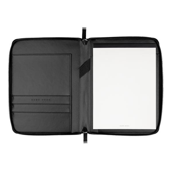 Starannie wykonana z wyszukanym wzorem w jodełkę, przypominającym garnitur domu mody, teczka Herringbone A5 z charakterystyczną chromowaną płytą metalową Hugo Boss jest ponadczasowa i elegancka.