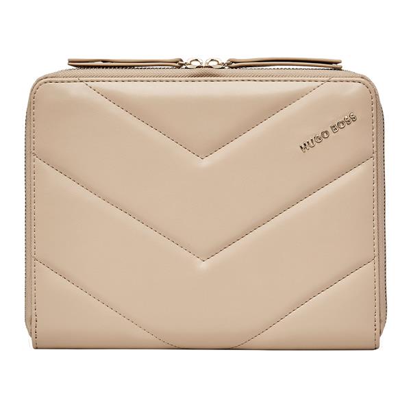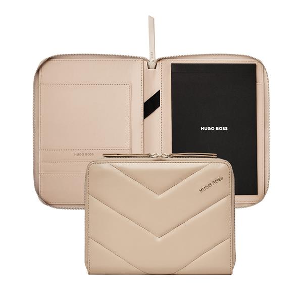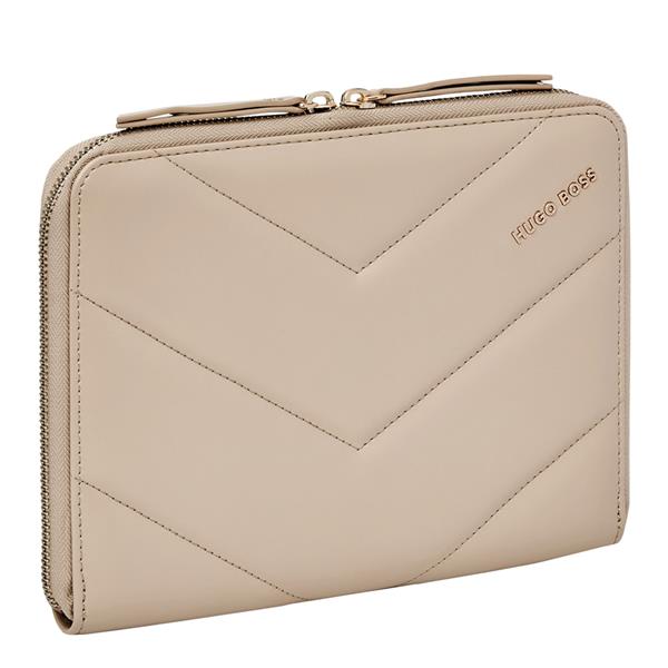 Kobiece i eleganckie teczki Triga są wzbogacone o luksusowe złote akcenty i matową fakturę skóry wegańskiej. Podpisane są piękną złotą płytką z logo HUGO BOSS, a ich powierzchnia jest pikowana geometrycznym i graficznym wzorem, co czyni je zarówno nowoczesnymi jak i kobiecymi. Teczka A5 dostępna jest w 3 luksusowych i ciepłych odcieniach: czarnym, beżowym lub taupe. Będzie idealnym towarzyszem na co dzień, pozwalając na robienie notatek na papierowej podkładce, ale także posiadając kremowe wnętrze, które pozwoli uporządkować wszystkie dokumenty. Linia `Triga` jest idealna do łączenia i dopasowywania w kombinacje, które odpowiadają Twojemu gustowi, aby stworzyć skromne, ale wyrafinowane zestawy prezentowe.