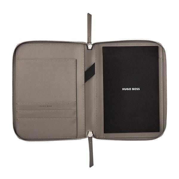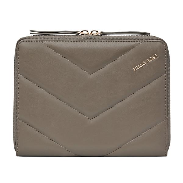 Kobiece i eleganckie teczki Triga są wzbogacone o luksusowe złote akcenty i matową fakturę skóry wegańskiej. Podpisane są piękną złotą płytką z logo HUGO BOSS, a ich powierzchnia jest pikowana geometrycznym i graficznym wzorem, co czyni je zarówno nowoczesnymi jak i kobiecymi. Teczka A5 dostępna jest w 3 luksusowych i ciepłych odcieniach: czarnym, beżowym lub taupe. Będzie idealnym towarzyszem na co dzień, pozwalając na robienie notatek na papierowej podkładce, ale także posiadając kremowe wnętrze, które pozwoli uporządkować wszystkie dokumenty. Linia `Triga` jest idealna do łączenia i dopasowywania w kombinacje, które odpowiadają Twojemu gustowi, aby stworzyć skromne, ale wyrafinowane zestawy prezentowe.