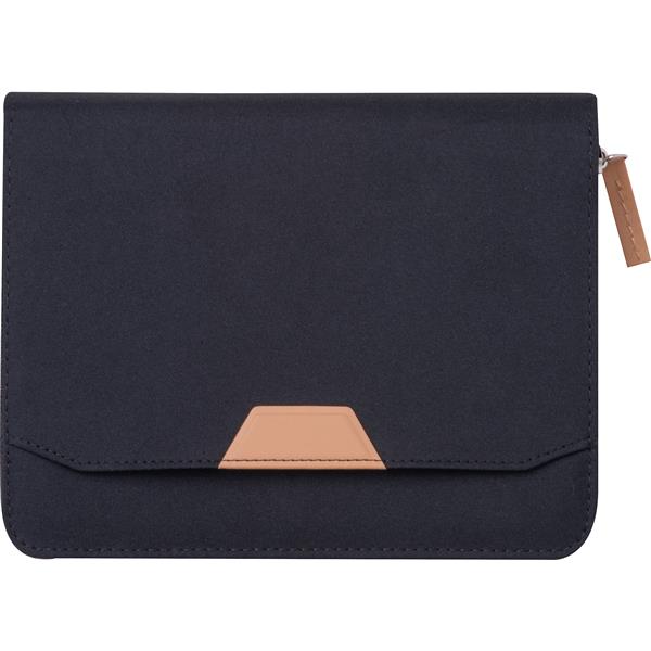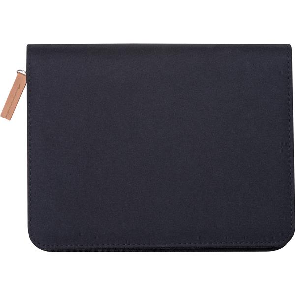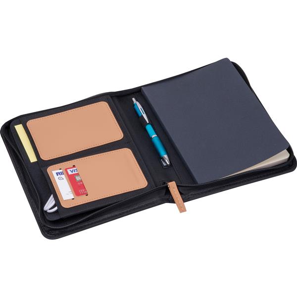 Teczka na dokumenty o formacie A5, wykonana z poliestru z recyklingu, wyposażona w zamek błyskawiczny oraz wyjmowany notes z 144 stronami w linie, wykonanymi z papieru z trzciny cukrowej. Wewnątrz teczki znajduje się duża komora na dokumenty oraz mniejsze kieszonki na akcesoria.