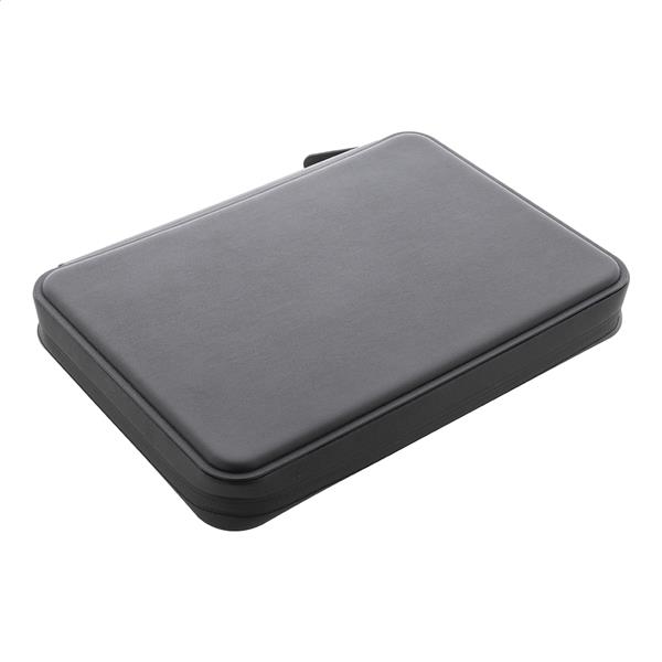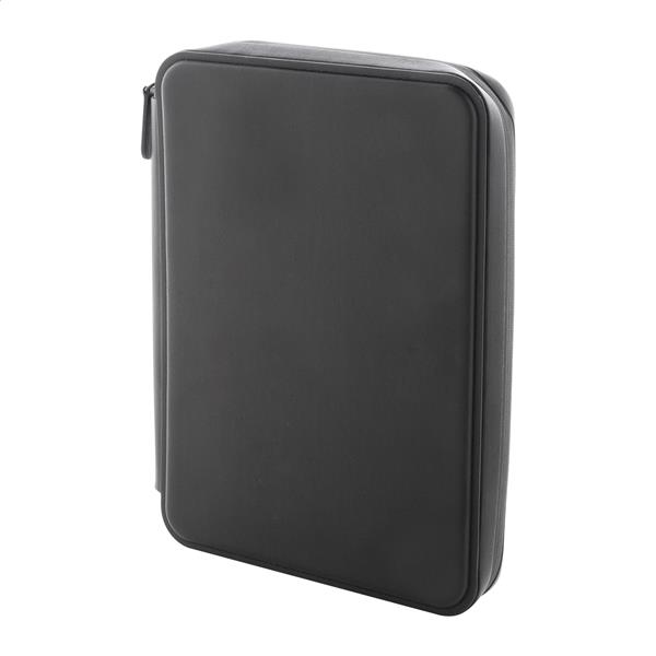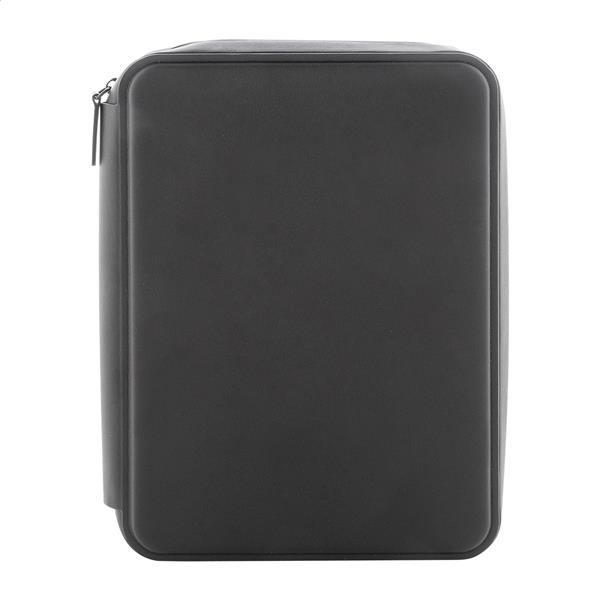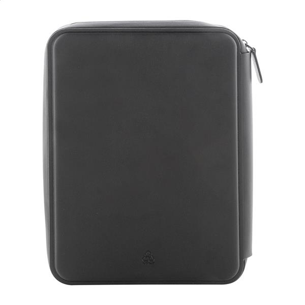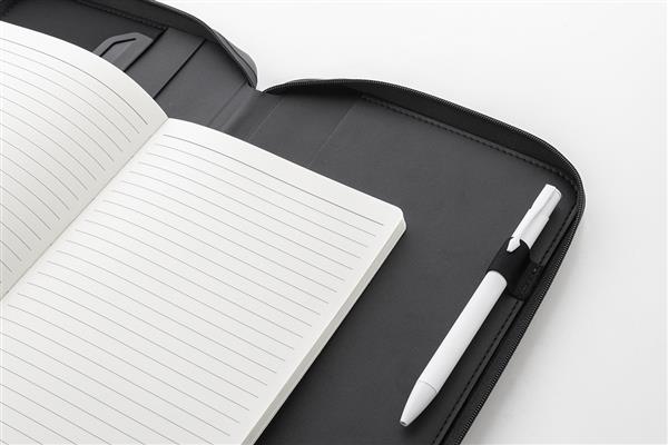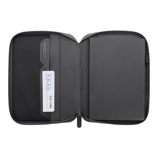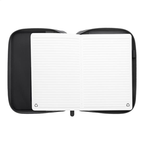 Luksusowa teczka na dokumenty zapinana na suwak, wykonana z recyklingowanej skóry PU, z 64-kartkowym notatnikiem w linie z papieru pochodzącego z recyklingu. Z wieloma wewnętrznymi kieszonkami na karty i dokumenty. Format A5.