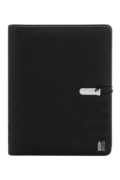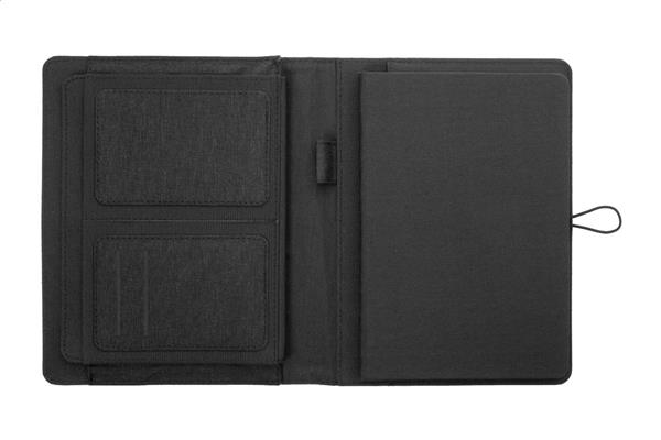 Teczka na dokumenty formatu A5, wykonana z poliestru 300D RPET, z notatnikiem 64 kartki w linie i wieloma wewnętrznymi kieszeniami z organizerem.