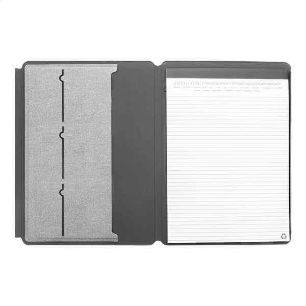 Teczka na dokumenty z recyklingowanej skóry PU w ??formacie A4 z wewnętrznymi kieszeniami organizacyjnymi i magnetycznym zamknięciem. Z notatnikiem w linie z 20 kartkami z papieru z recyklingu.
