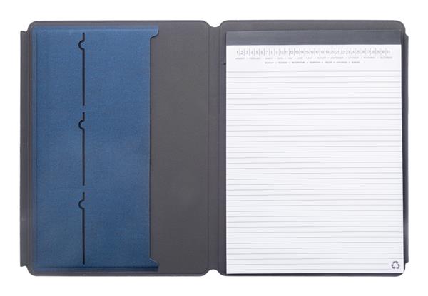 Teczka na dokumenty z recyklingowanej skóry PU w ??formacie A4 z wewnętrznymi kieszeniami organizacyjnymi i magnetycznym zamknięciem. Z notatnikiem w linie z 20 kartkami z papieru z recyklingu.