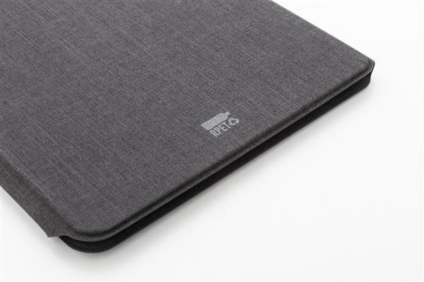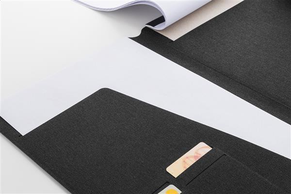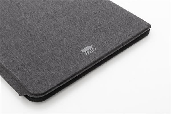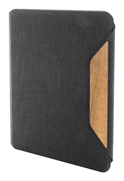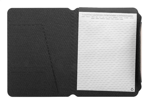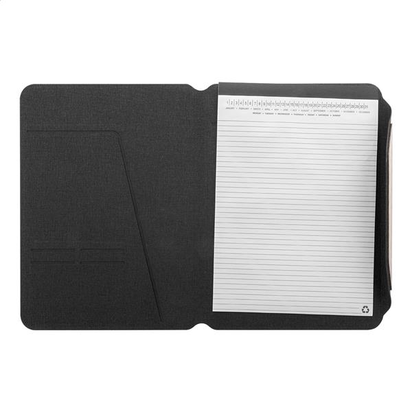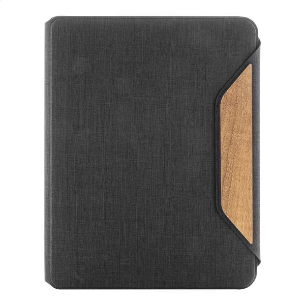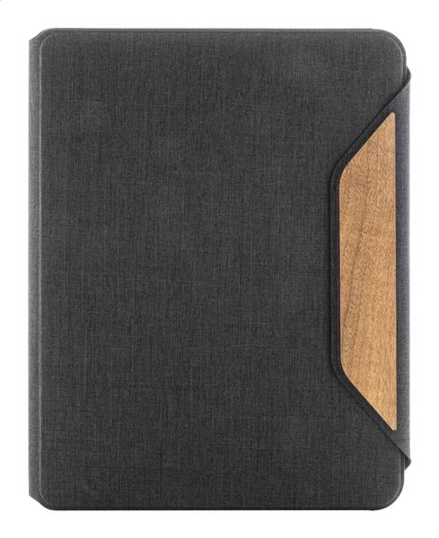 Teczka na dokumenty w formacie A4, wykonana z poliestru RPET, z wieloma wewnętrznymi kieszeniami organizacyjnymi i magnetycznym zamknięciem z detalami z drewna orzechowego. Z 20-kartkowym notatnikiem w linie z papieru z recyklingu.