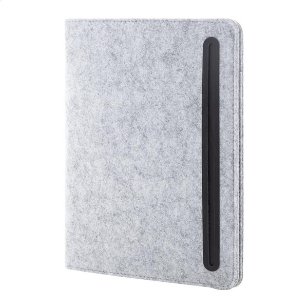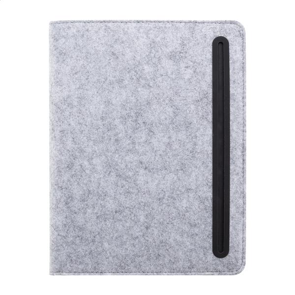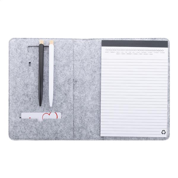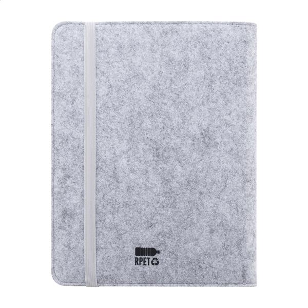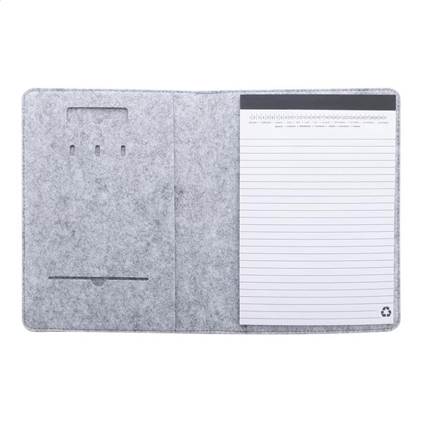 Teczka na dokumenty z filcu RPET w formacie A5 z przednią i wieloma wewnętrznymi kieszeniami organizacyjnymi. Z 20 kartkami w linie z papieru pochodzącego z recyklingu.