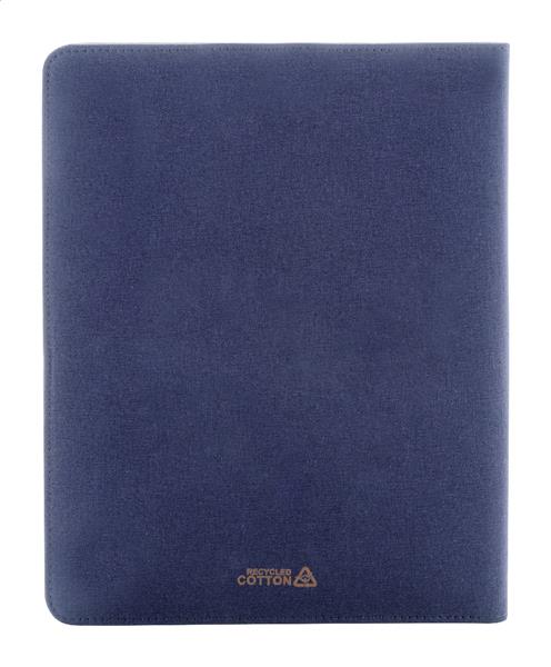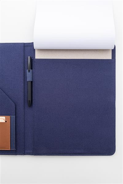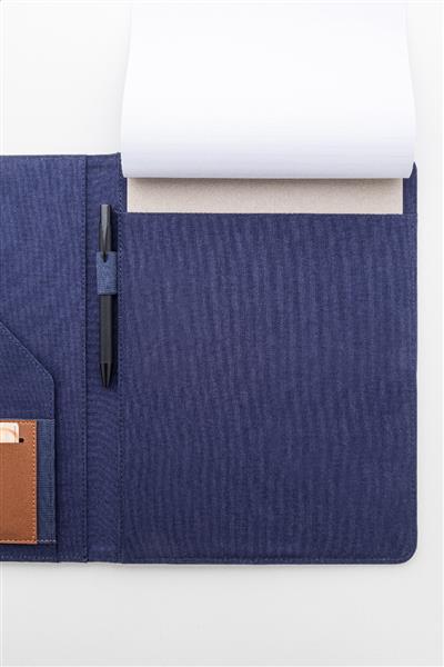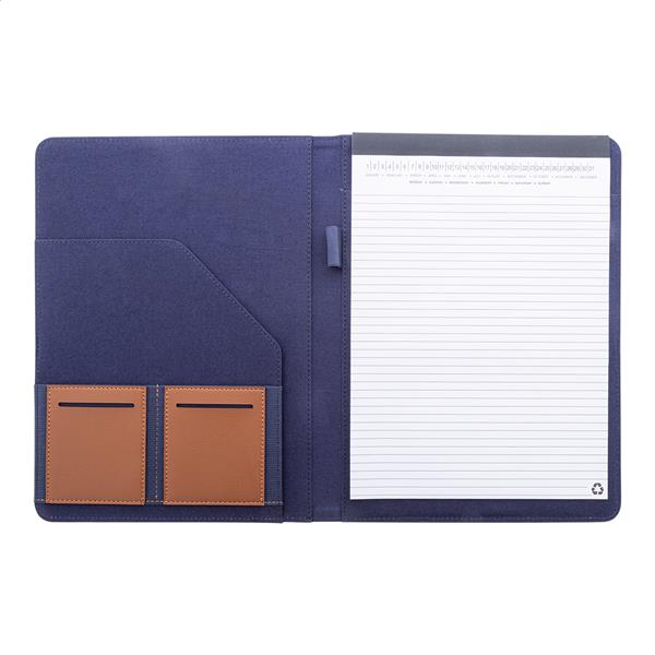 Teczka na dokumenty w formacie A4, wykonana z płótna z recyklingu i skóry PU z recyklingu, z wieloma kieszeniami z przodu i wewnątrz. Zawiera 20-kartkowy notatnik w linie z papieru z recyklingu. 70% bawełny z recyklingu i 30% poliestru RPET.