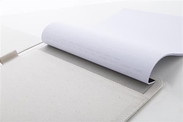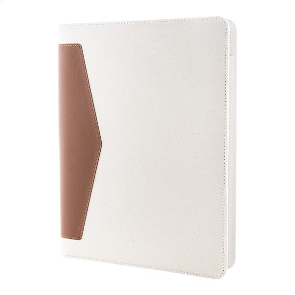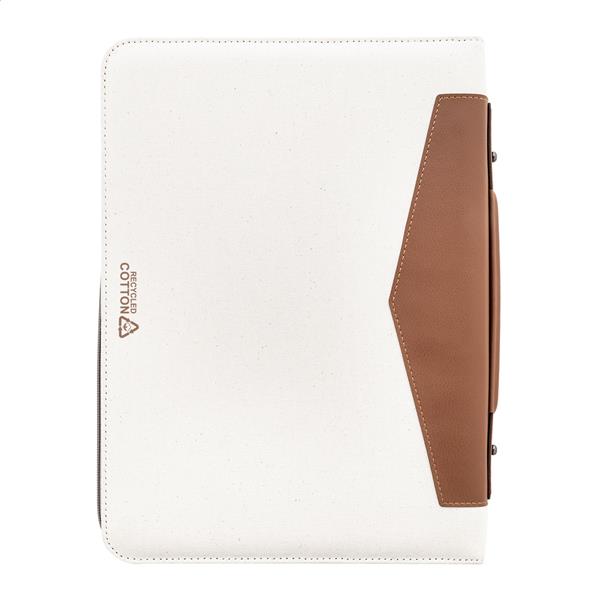 Teczka na dokumenty w formacie A4, z płótna z recyklingu i skóry PU z recyklingu z wieloma wewnętrznymi kieszeniami organizacyjnymi. Z notatnikiem w linie z 20 kartkami z papieru z recyklingu. 70% bawełny z recyklingu i 30% poliestru RPET.