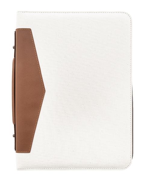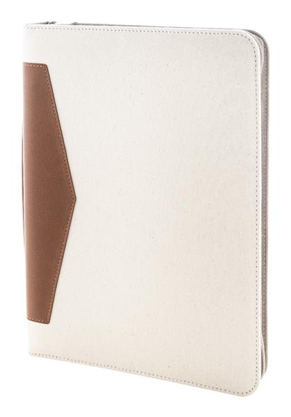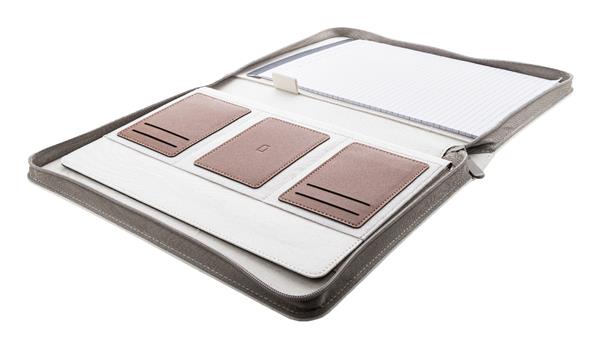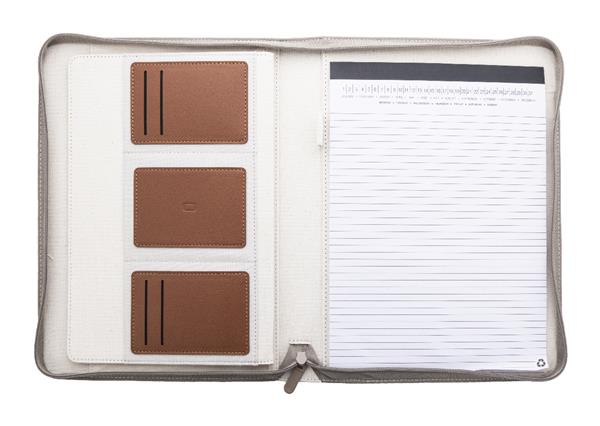 Teczka na dokumenty w formacie A4, z płótna z recyklingu i skóry PU z recyklingu z zamykaną na zamek komorą na dokumenty i z wieloma wewnętrznymi kieszeniami organizacyjnymi. Z notatnikiem w linie z 20 kartkami z papieru z recyklingu. 70% bawełny z recyklingu i 30% poliestru RPET.