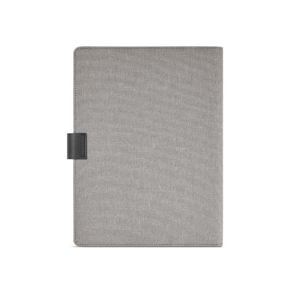 Teczka 300D rPET A4 z magnetycznym zamknięciem pozwala uporządkować zawartość bez wysiłku. Zabezpiecza zawartość, taką jak tablet (do 29 x 18 cm), 64-arkuszowa podkładka z papieru w kropki FSC w kolorze kości słoniowej (70 g/m2), telefon (do 10 x 18 cm), 2 karty i długopis.