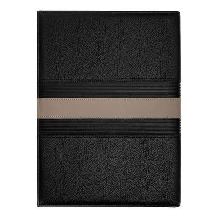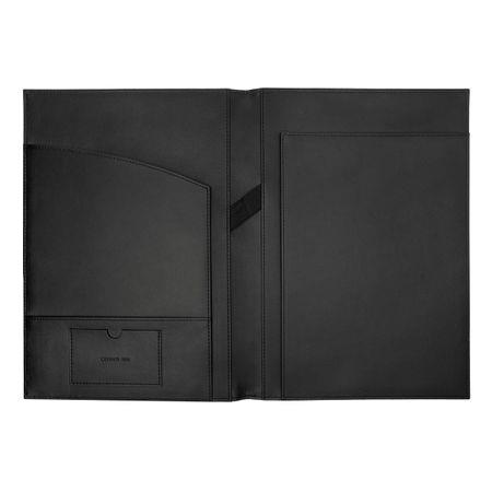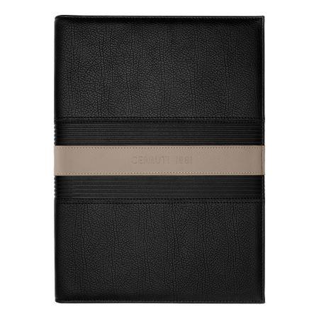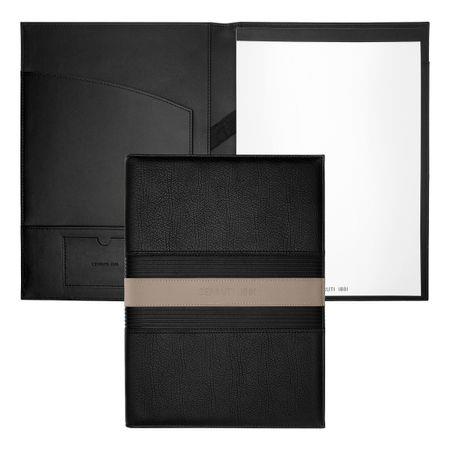 Przedstawiamy teczki do pisania CERRUTI 1881 `Delano`, wykonane z wegańskiej skóry w klasycznej czerni z kontrastującym beżowym paskiem i dużym, subtelnie wytłoczonym logo. Te teczki, dostępne w formatach A4 i A5, oferują stylową opcję robienia notatek na spotkaniach lub zapisywania myśli w podróży.