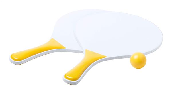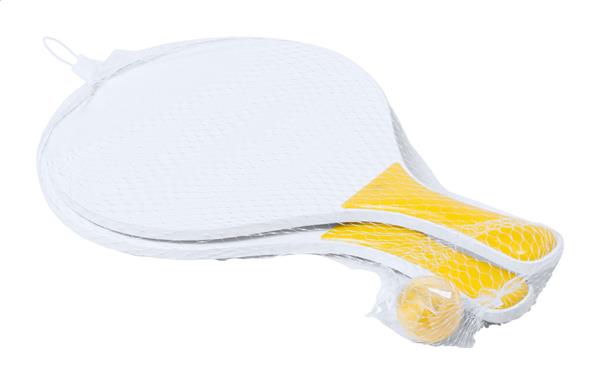 Tenis plażowy z 2 dużymi rakietami i jedną piłką, wykonany z drewna i plastiku. Description: Tenis plażowy z 2 dużymi rakietami i jedną piłką, wykonany z drewna i plastiku. Primary Color: żółty Material 1: Drewno Secondary Color: biały Material 2: Plastik Rozmiar: 235×380×8 mm
