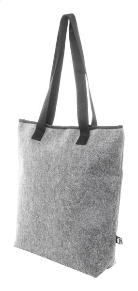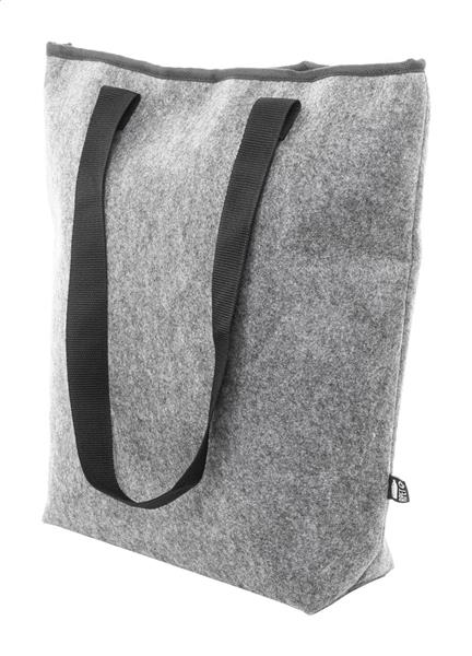 Torba termiczna na zakupy z filcu RPET z aluminiową wyściółką. Z zapięciem na rzep, kieszenią z przodu zapinaną na suwak i długimi uchwytami. Z charakterystyczną metką RPET.