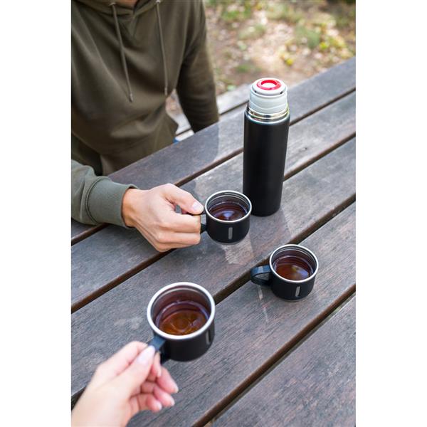 Zestaw podróżny, termos 420 ml, posiada podwójne ścianki ze stali nierdzewnej z próżnią między ściankami, co spowalnia oddawanie temperatury na zewnątrz, 3 kubki 150 ml w zestawie, produkt wykonany ze stali nierdzewnej i plastiku, utrzymuje temperaturę napojów gorących do 20 godzin +leakproof
