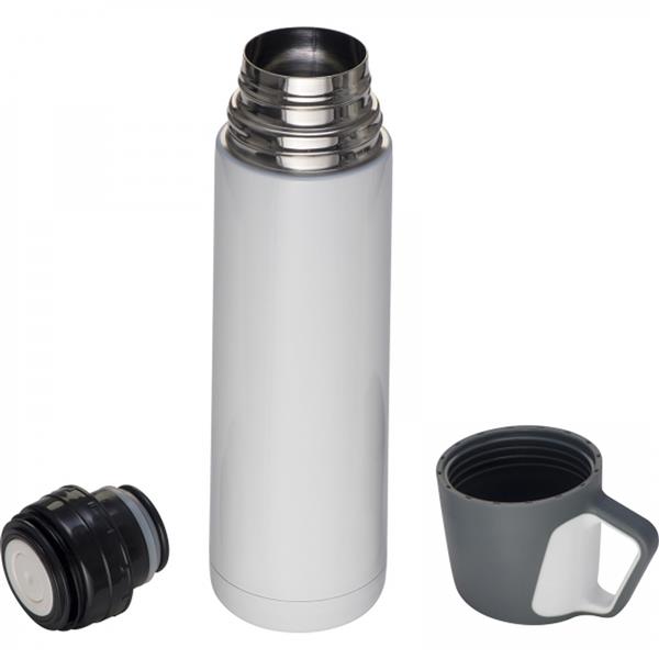 Termos ze stali nierdzewnej z izolacją próżniową. Zawiera plastikowy kubek. Pojemność 500 ml.