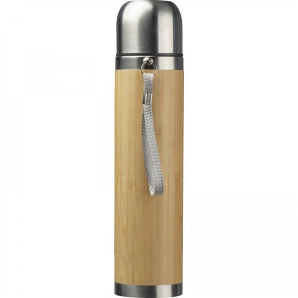 Termos z podwójnymi ściankami ze stali nierdzewnej (izolacja próżniowa) w bambusowej obudowie, z kubkiem i paskiem na rękę. Pojemność 500 ml.