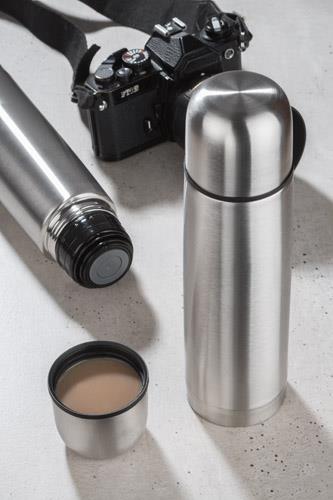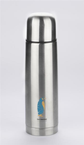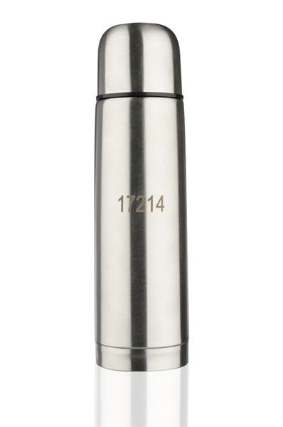 Termos o podwójnych ściankach, wykonany ze szlachetnej stali, został wyposażony w praktyczne zamknięcie oraz metalowy kubek. Pojemność termosu 500 ml, nakrętki-kubeczka 90 ml. Logo grawerujemy na powierzchni termosu.