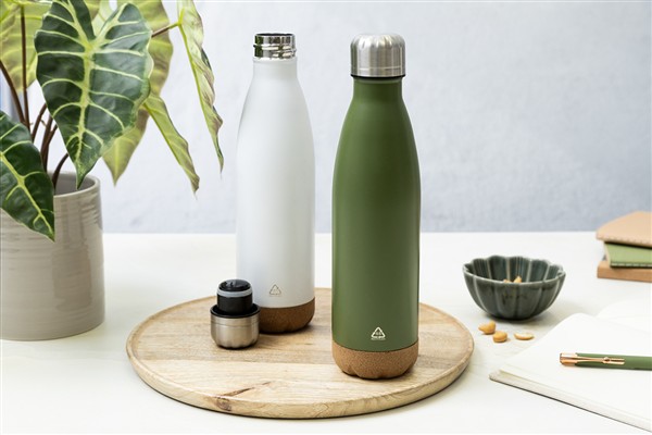 Butelka z podwójną ścianką, izolowana próżniowo ze stali nierdzewnej pochodzącej z recyklingu, z podstawą z naturalnego korka. 500 ml