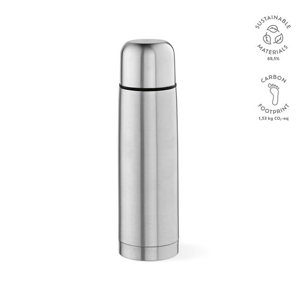 Wzbogac swój dzien dzieki naszemu termosowi o pojemnosci 500 ml – jego zywym kolorom i ekologicznej energii. Wykonany z recyklingowanej stali nierdzewnej z podwójna izolacja prózniowa, utrzymuje napoje w najlepszym stanie, zarówno podczas wedrówki, jak i w biurze (kubek 9,9 cl).