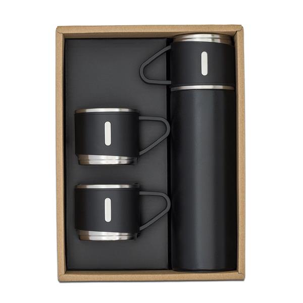 Termos o pojemności 500 ml w komplecie z 3 kubkami. Praktyczny zestaw na wędrówki i podróże w gronie przyjaciół lub rodziny. Pojemność kubka 150 ml.