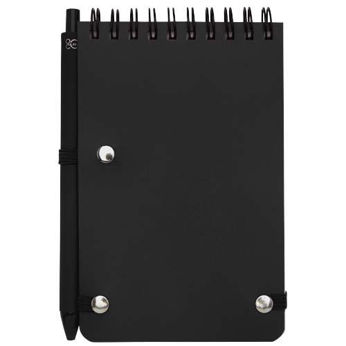 Notatnik w twardej oprawie Thalaasa w formacie A6 jest wykonany z przetworzonego plastiku pochodzącego z oceanów i zawiera 80 kartek w linie o gramaturze 70 g/m2 w kolorze kremowym. Notatnik ma zaokrąglone rogi, elastyczne zamknięcie i szlufkę na długopis. Długopis z czarnym tuszem również został wykonany z plastiku pochodzącego z recyklingu i wyrzuconego do oceanu. Żywotność: 1000 metrów. Rozmiar stalówki: 1,0 mm.